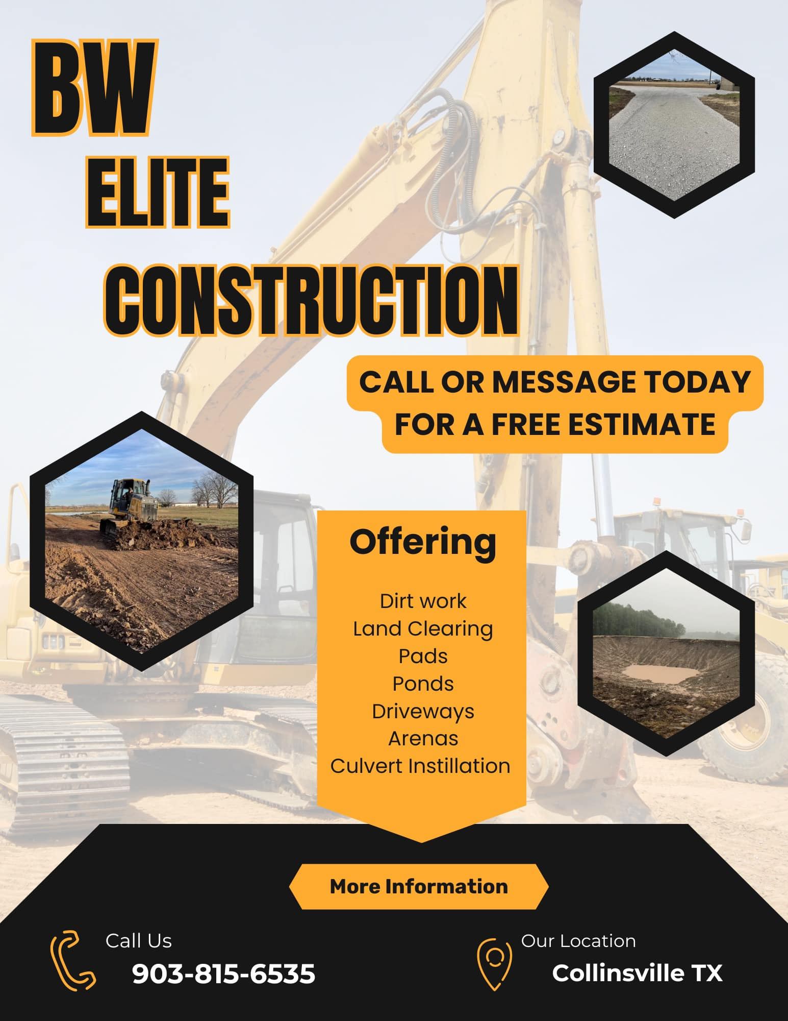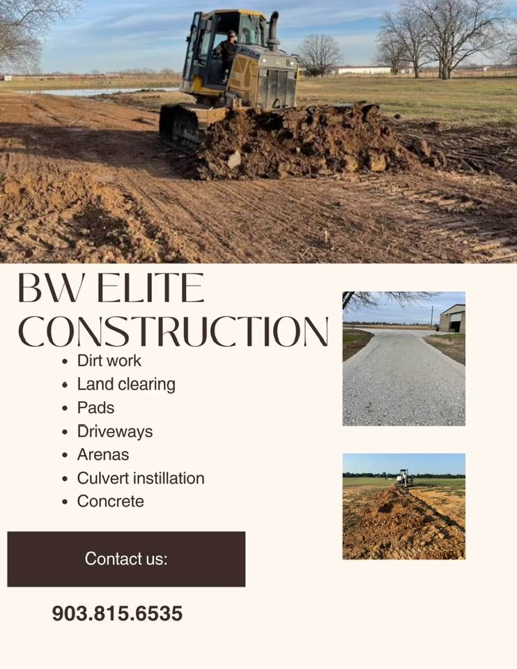 At BW Elite Construction, our mission is to deliver reliable, high-quality construction and land development services that stand the test of time. We take pride in turning raw land into functional, beautiful, and lasting spaces. Whether it’s dirt work, land clearing, or building driveways and ponds, we approach every project with precision, integrity, and a commitment to excellence. Our goal is simple — to exceed client expectations through honest work, dependable service, and expert craftsmanship.
